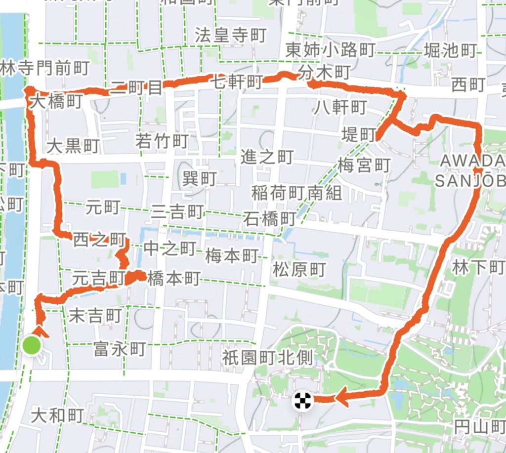 ● 内容(コース) 約 2km 南座〜白川新橋・辰巳橋〜三条大橋〜三条古川町〜青蓮院(拝観はしません)〜知恩院 〜円山公園