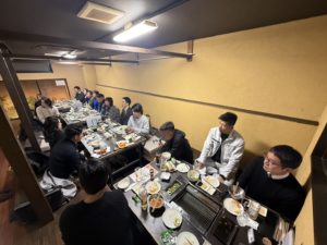 2月13日に西京支部会員 長井さんのお店、肉料理 陽気で『参繋の会』を開催しました。 22名の参加で、いつもはフォローとして幹事の方々にも参加を募っておりましたが、 今回は宮尾支部長の意向もあり、入会3年未満の会員だけでの開催を試みました。 ですが、入会したての会員さんがおられて紹介者が我らが矢野代表理事でして矢野代表も