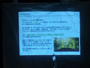ISSOの名前について、京都に根をおろしていきたいとのお話や、グラフィックデザイン制作のやマイクロドローン撮影の受託制作事業だけでなく、なら国際映画祭事務局などの運営代行事業や演劇事業もされていて、3本の事業をされているというお話もありました。